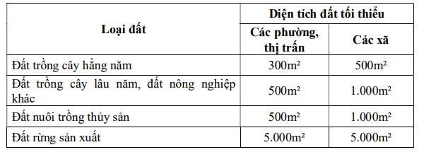 Đối đất nông nghiệp, thửa đất trồng cây hằng năm tại phường, thị trấn cần diện tích tối thiểu 300m2, cây lâu năm 500m2 và rừng sản xuất 5.000m2. Tại các xã, diện tích tương ứng là 500m2, 1.000m2 và 5.000m2. Quy định này giúp bảo đảm quy mô canh tác hợp lý, tránh việc chia nhỏ gây khó khăn cho sản xuất nông nghiệp. Theo đó, phải bảo đảm diện tích tối thiểu với loại đất đang sử dụng bao gồm:
