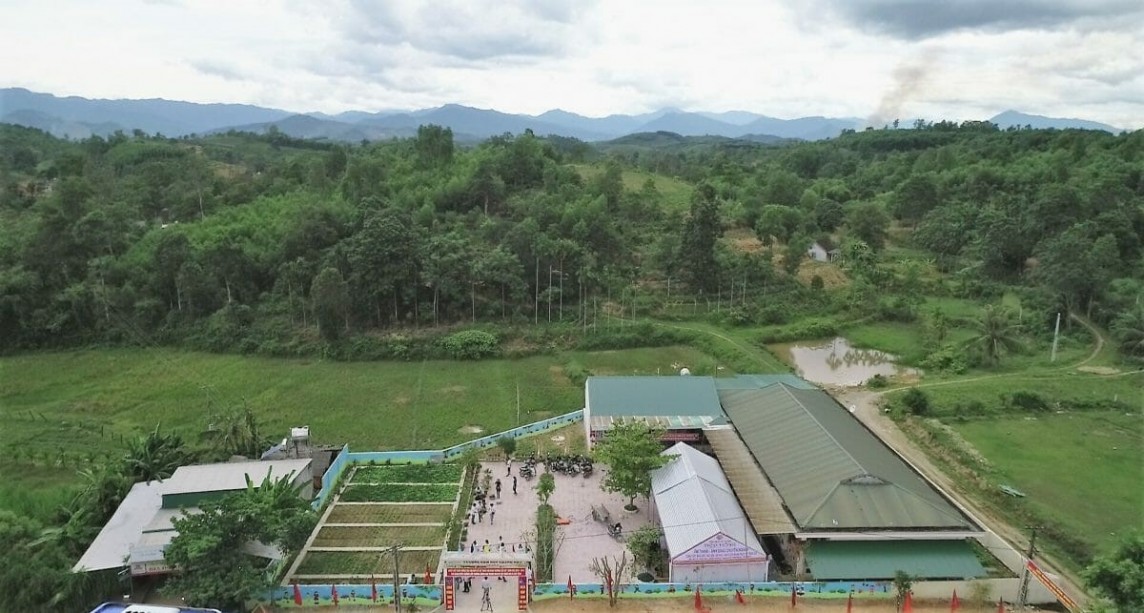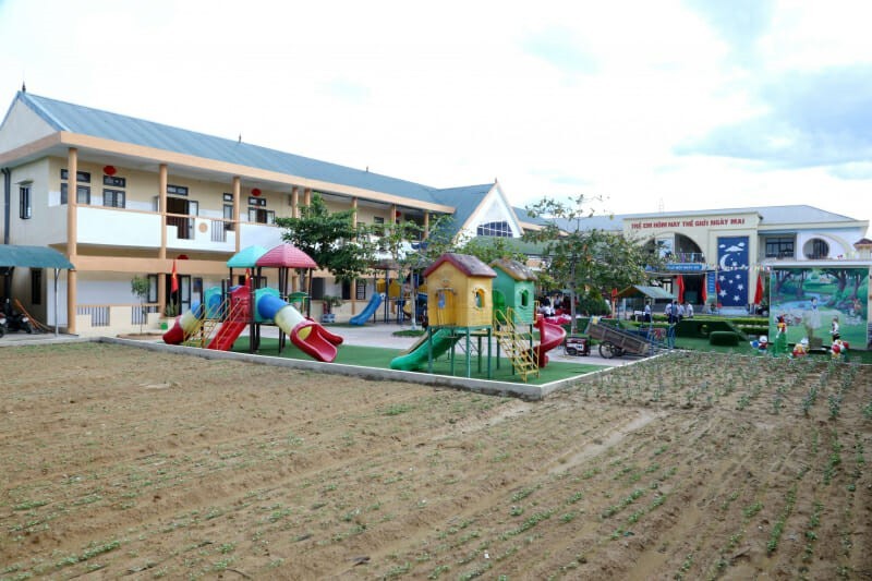 | Tòa nhà chức năng 2 tầng (bên trái ảnh) tầng 1 là nhà ăn bán trú; tầng 2 có 3 phòng làm việc được DELTA Group xây dựng. |