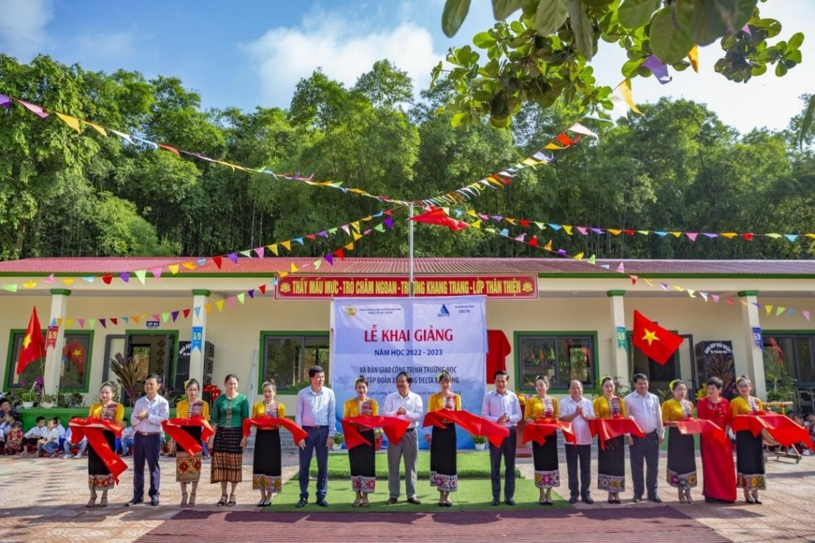 | Lễ khai giảng và bàn giao điểm trường tại bản Đồng Tiến, xã Lạng Khê, huyện Con Cuông, Nghệ An. Sau khi hoàn thiện, ngôi trường có khuôn viên rộng khoảng 2.200 m2 với sân trường rộng 650 m2, vườn trường rộng 550 m2, 6 phòng học được xây mới có tổng diện tích 320 m2, cùng các hạng mục như cổng trường, nhà để xe 47m2, nhà chờ 50m2, hàng rào dài 100m, 20m hành lang và nhà vệ sinh. Tiếp đó, DELTA Group đã tiến hành cải tạo khối nhà học 50m2 thành khối nhà hiệu bộ, thư viện, phòng giáo viên. Thêm nữa, DELTA Group cũng đầu tư thêm cơ sở vật chất cho giảng dạy như hệ thống bàn ghế, giá sách thư viện, trang bị máy vi tính, tivi, hệ thống bảng viết. |