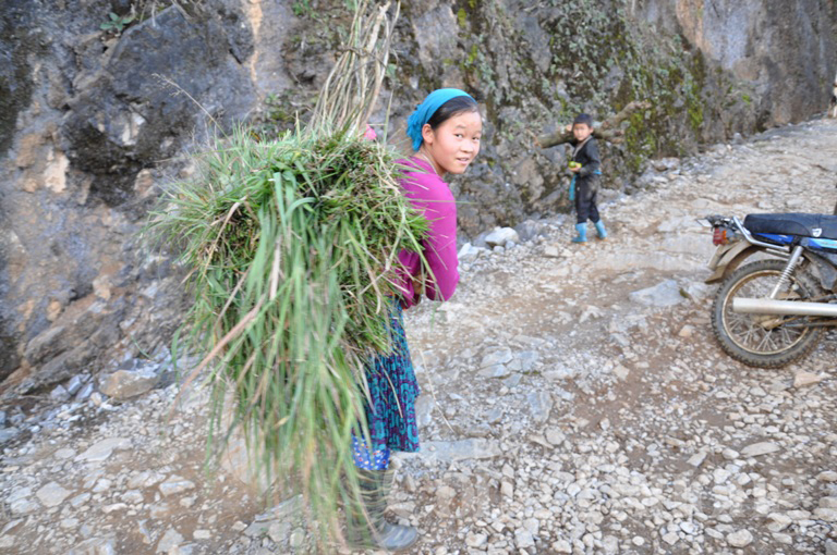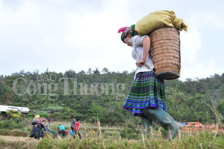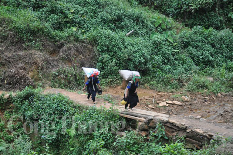 Việc mang vác đã trở thành việc thường ngày của phụ nữ Mông