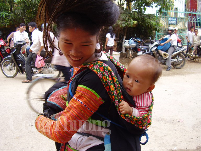 Nếu hiếm hoi gặp người phụ nữ Mông nào không cõng theo củi, nông sản hay hàng hóa…thì thế nào trên lưng họ cũng là 1 em bé nhỏ đang say ngủ với đôi má ứng hồng hoặc ngơ ngác nhìn quanh với đôi mắt tròn đen láy. Dường như, đôi lưng mảnh dẻ của người phụ nữ Mông rất ít khi được nghỉ ngơi…