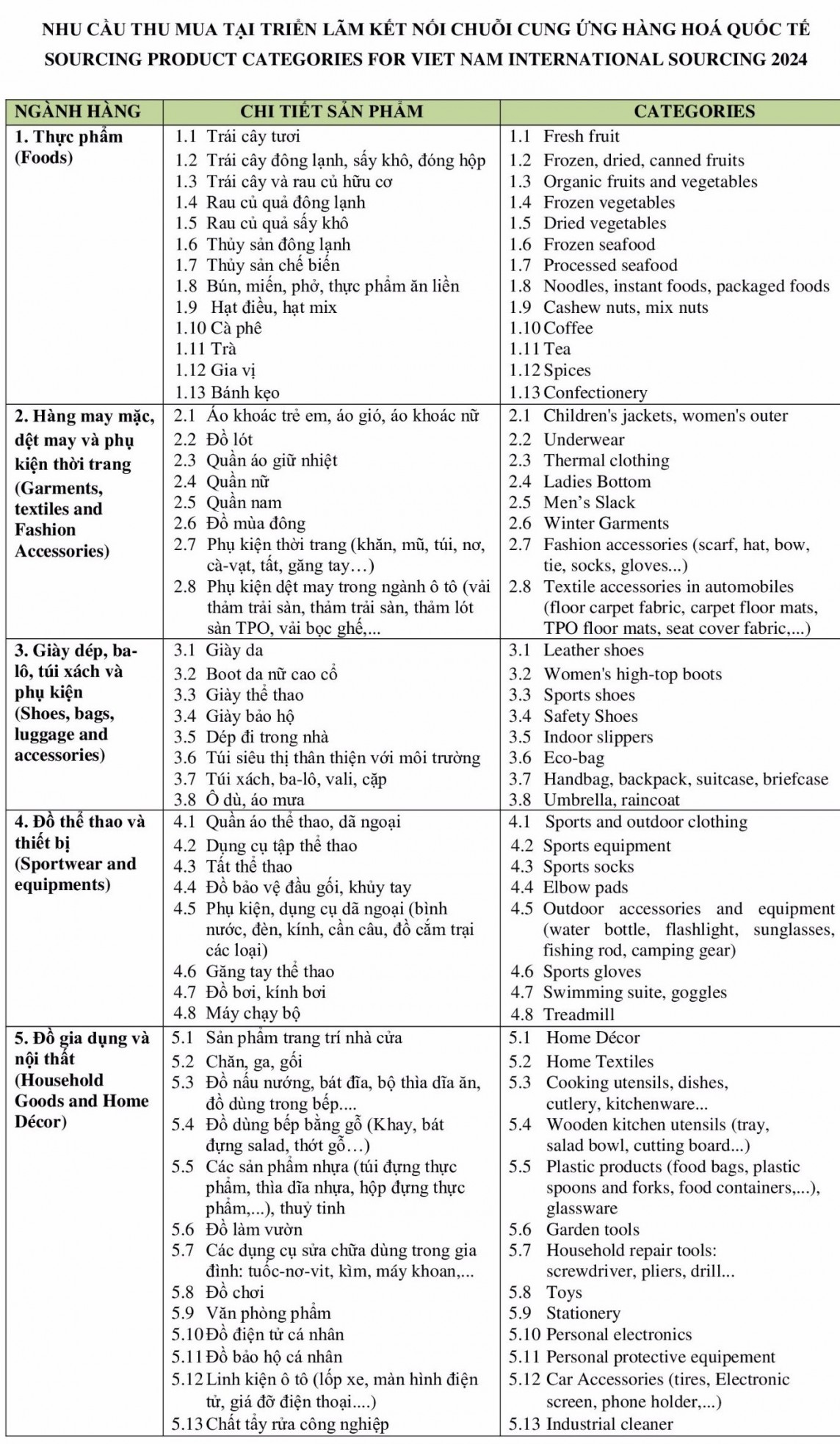 | Chi tiết danh sách các mặt hàng được nhà thu mua quốc tế săn lùng tại Viet Nam International sourcing 2024 |