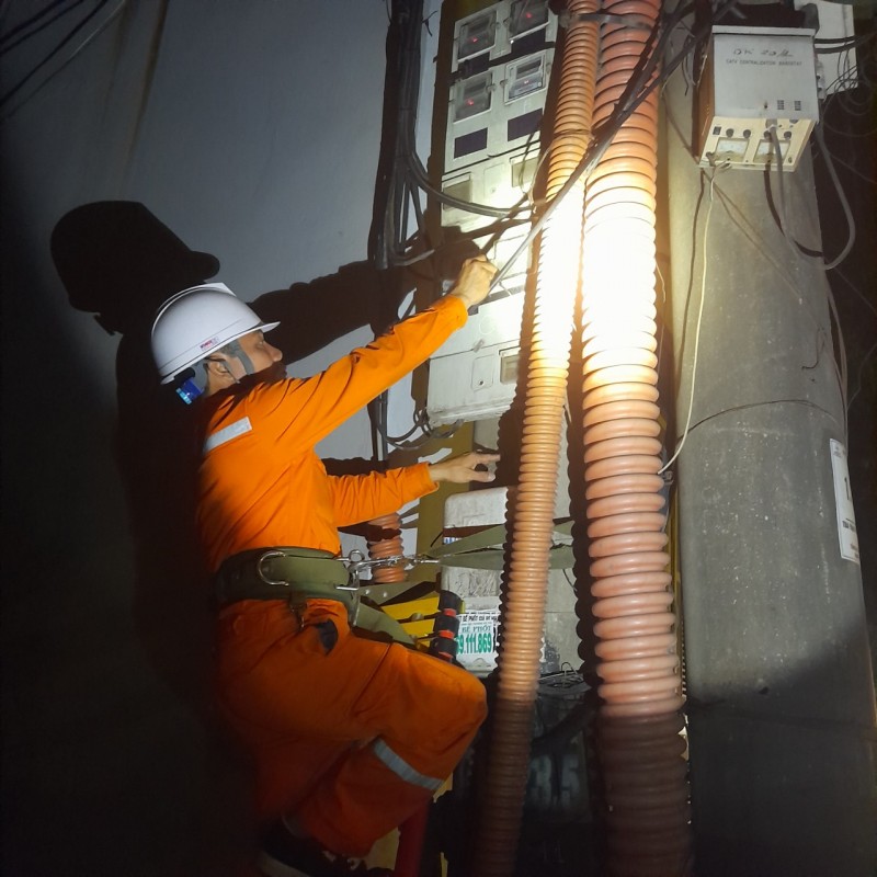 | Công nhân Công ty Điện lực Ninh Bình khắc phục sự cố lưới điện vào ban đêm |