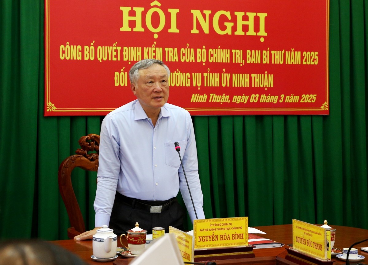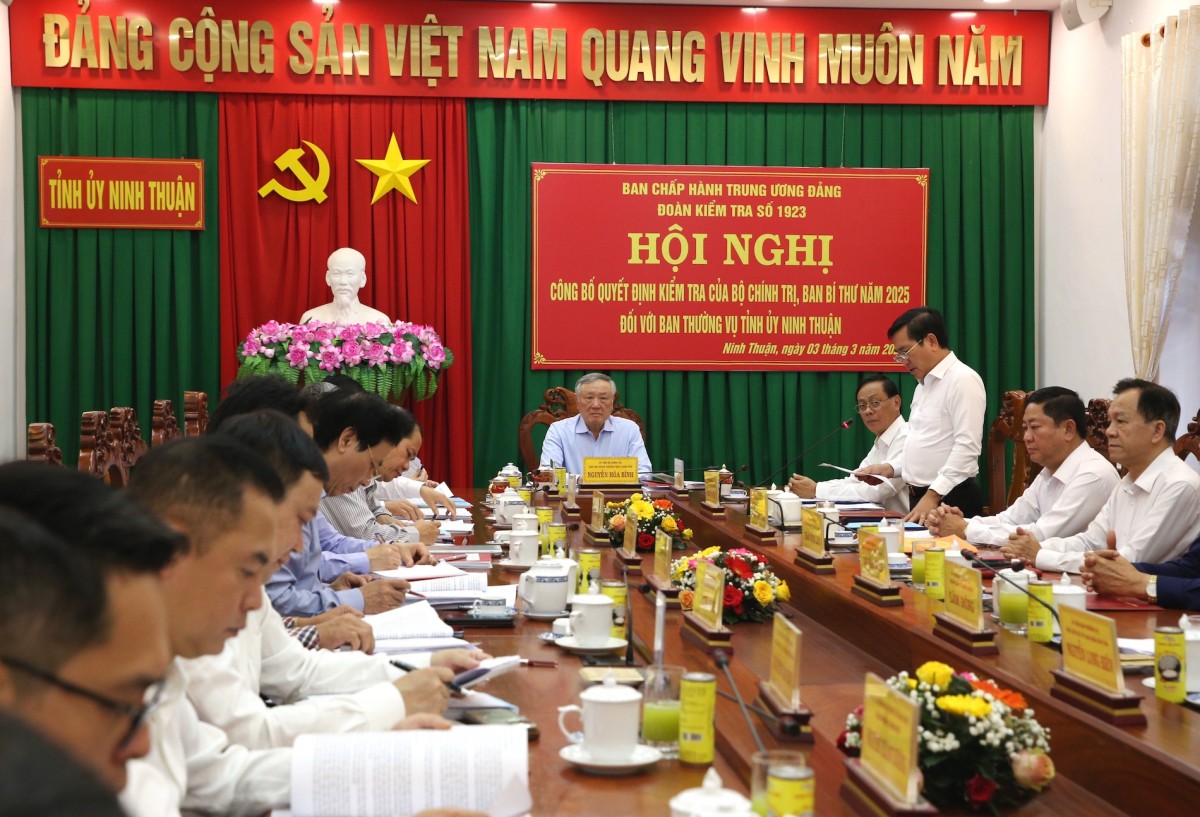 Chiều 3/3, Đoàn kiểm tra số 1923 do Ủy viên Bộ Chính trị, Bí thư Trung ương Đảng, Phó Thủ tướng Thường trực Chính phủ Nguyễn Hòa Bình làm Trưởng đoàn đã công bố quyết định kiểm tra của Bộ Chính trị, Ban Bí thư năm 2025 đối với Ban Thường vụ Tỉnh ủy Ninh Thuận. Tham gia Đoàn kiểm tra có Phó Thủ tướng Chính phủ Mai Văn Chính; Ủy viên Ủy ban Kiểm tra Trung ương Nguyễn Văn Hội và các thành viên Đoàn kiểm tra là đại diện một số ban, cơ quan của Đảng, Chính phủ.