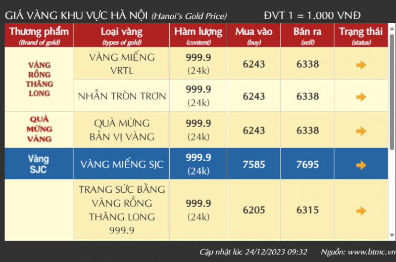 Tính đến 10h15 ngày 24/12, giá vàng SJC tại Công ty Doji Hà Nội giao dịch từ 75,70-77,00 triệu đồng/lượng mua vào/bán ra, giảm 300 đồng chiều mua vào và bằng giá chiều bán ra so với ngày hôm qua.