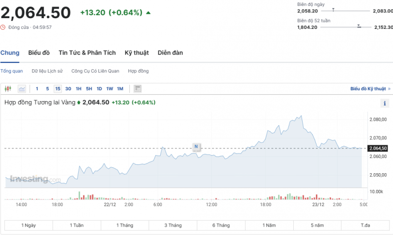 Giá vàng trên sàn Kitco chốt phiên cuối tuần giao dịch ở mức 2.052 USD/ounce, tăng 0,36%. Giá vàng tương lai giao tháng 2/2024 trên sàn Comex New York giao dịch ở mức 2.064 USD/ounce.