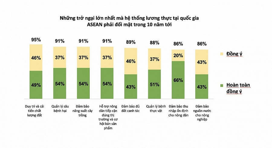 Khi được hỏi đâu sẽ là những trở ngại lớn nhất mà hệ thống lương thực tại quốc gia của họ sẽ phải đối mặt trong 5 năm tới, hơn một nửa (51%) cho rằng quản lý tác động và ảnh hưởng của biến đổi khí hậu là thách thức cấp bách nhất hiện nay, cao hơn đáng kể so với tất cả các thách thức khác.