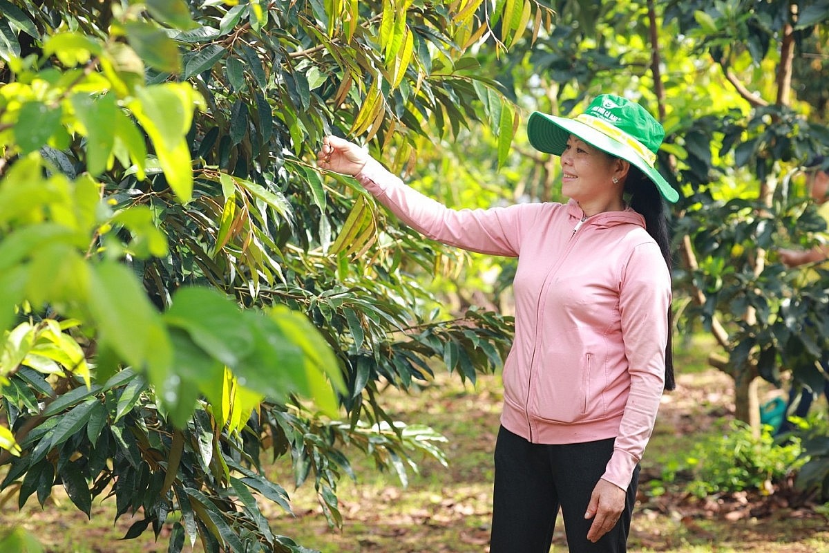 Tại huyện Di Linh, tỉnh Lâm Đồng, vườn sầu riêng của chị Tạ Thị Gấm nổi bật với tán lá xanh mướt, trái đều và phẩm chất tốt. Chị chia sẻ từ năm 2022, chị đã biết đến và áp dụng các “Bí Kíp Vàng” trong canh tác sầu riêng từ Phân Bón Cà Mau. Theo hướng dẫn, chị chăm sóc cây theo các phương pháp hiện đại ngay từ giai đoạn kiến thiết như: Quản lý nước và độ ẩm, tỉa cành tạo tán, bón phân hiệu quả. Đặc biệt, sự kết hợp NPK Cà Mau và phân bón hữu cơ cao cấp OM CAMAU giúp cây ra cơi đều, bản lá lớn và xanh bóng, tăng sức chống chịu.