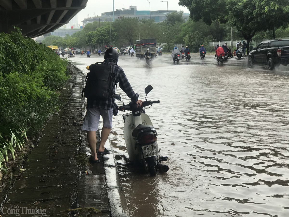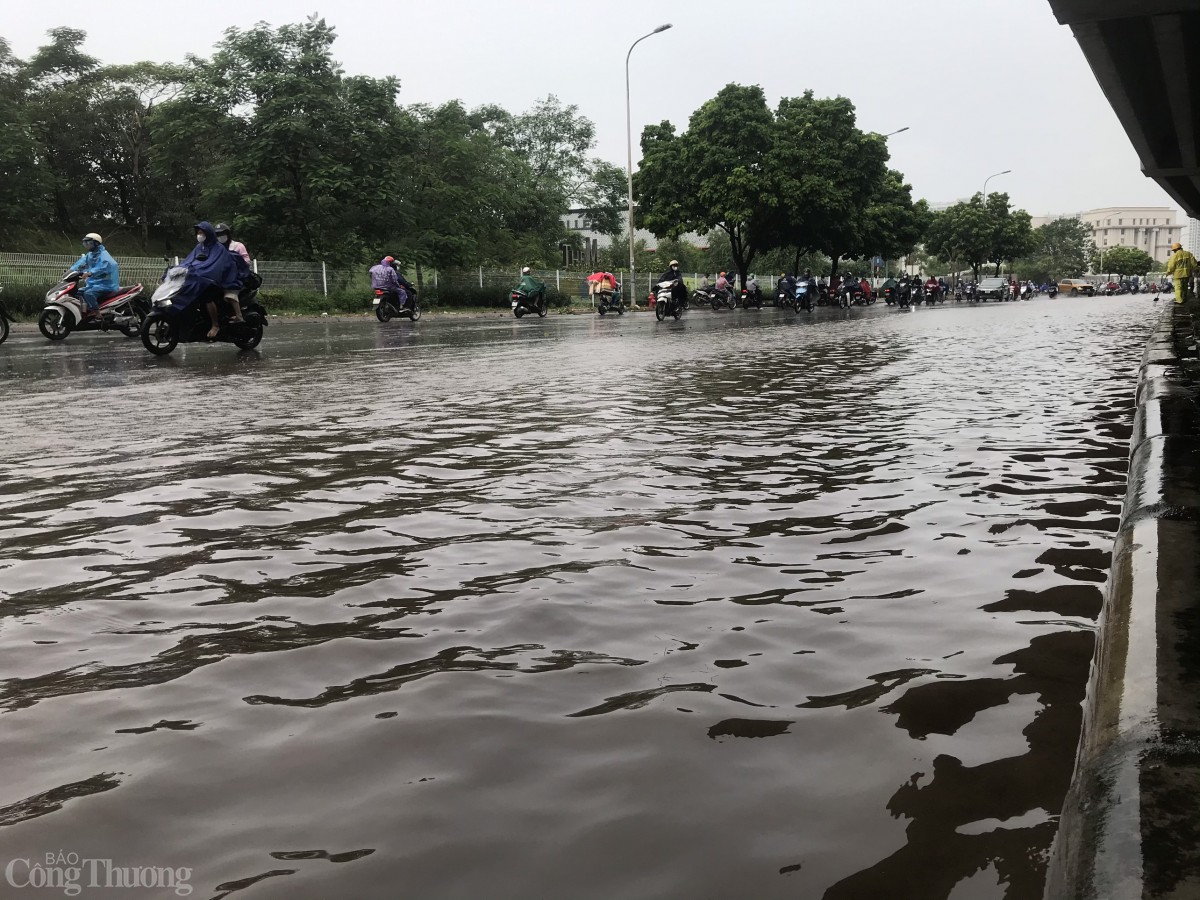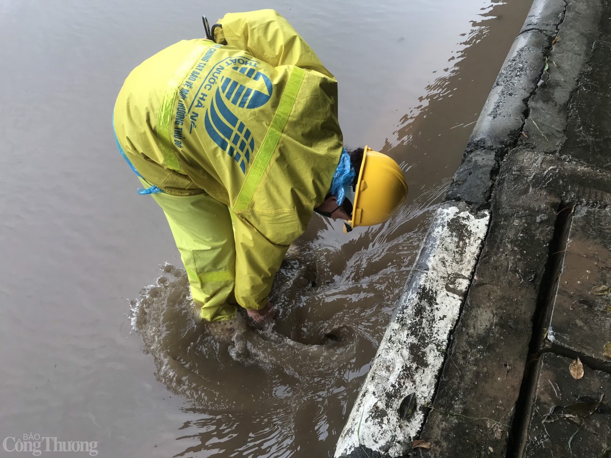 | Trao đổi với phóng viên Báo Công Thương, một nhân viên tại Công ty TNHH Một thành viên thoát nước Hà Nội chia sẻ: "Lượng mưa lớn vào đêm và sáng sớm khiến lượng nước dâng lên cao. Rác, lá cây bị trôi về các hố thoát nước gây ứ đọng. Hiện nay, chúng tôi đang giải quyết việc thoát nước tại đây, nước đã bắt đầu rút dần và dự kiến khoảng 10h sẽ đáp ứng cho giao thông thông suốt trở lại". Ảnh: Trần Đình |