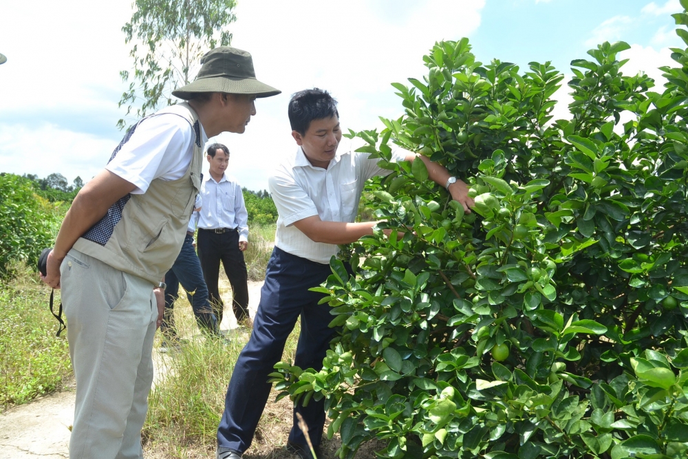 | Anh Nguyễn Văn Hiển (áo trắng) cùng các cộng sự khảo sát chanh tại ruộng |