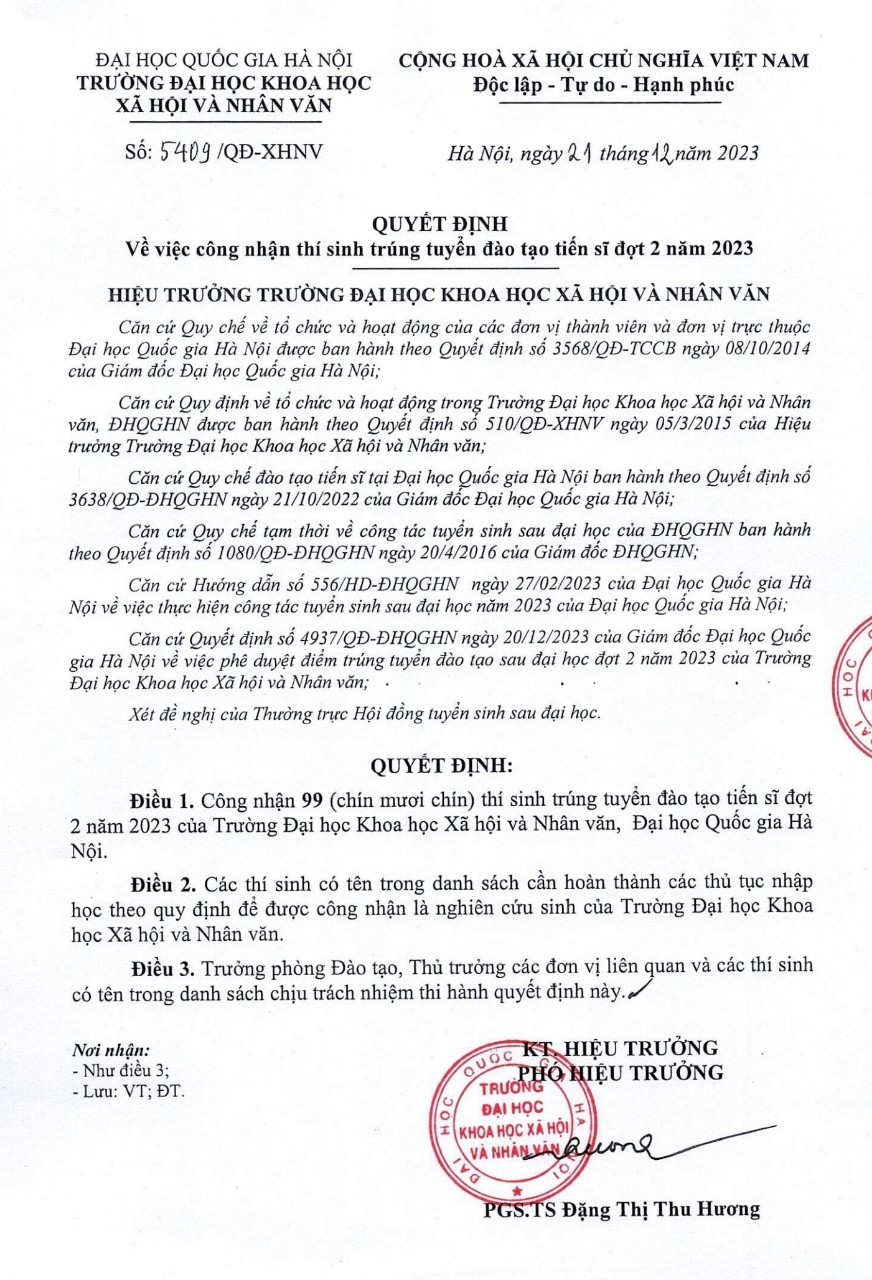 Quyết định nói trên do Phó Hiệu trưởng Trường Đại học Khoa học xã hội và Nhân văn Đặng Thị Thu Hương ký.