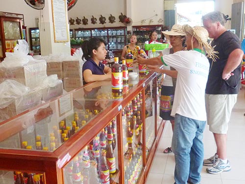 | Du khách mua nước mắm Phú Quốc tại một nhà thùng trên đảo |