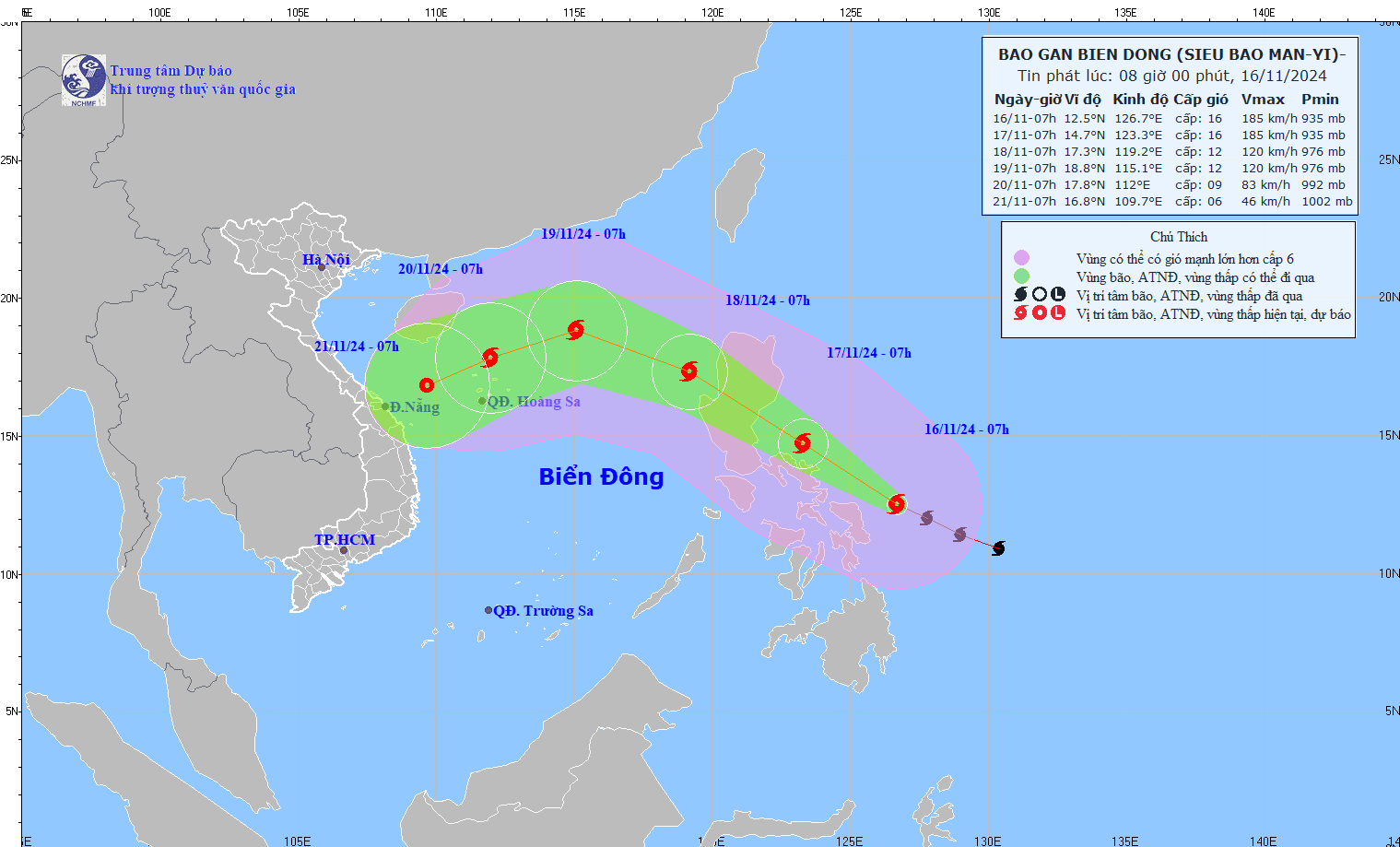 Theo Trung tâm Dự báo Khí tượng thủy văn Quốc gia, dự báo 07h/17/11, vị trí tâm bão ở vào khoảng 14,7N-123,3E; trên vùng biển phía Đông miền Trung Phi-líp-pin. Bão di chuyển theo hướng Tây Bắc, 20-25km/h, sức gió vùng gần tâm bão cấp 16, giật trên cấp 17.