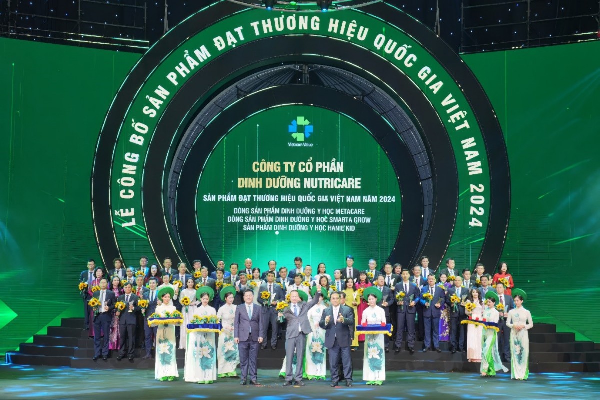 | Đại diện Nutricare giơ cao chứng nhận sản phẩm đạt Thương hiệu quốc gia Việt Nam 2024 sau khi được Thủ tướng và Bộ trưởng Bộ Công thương trao tặng |