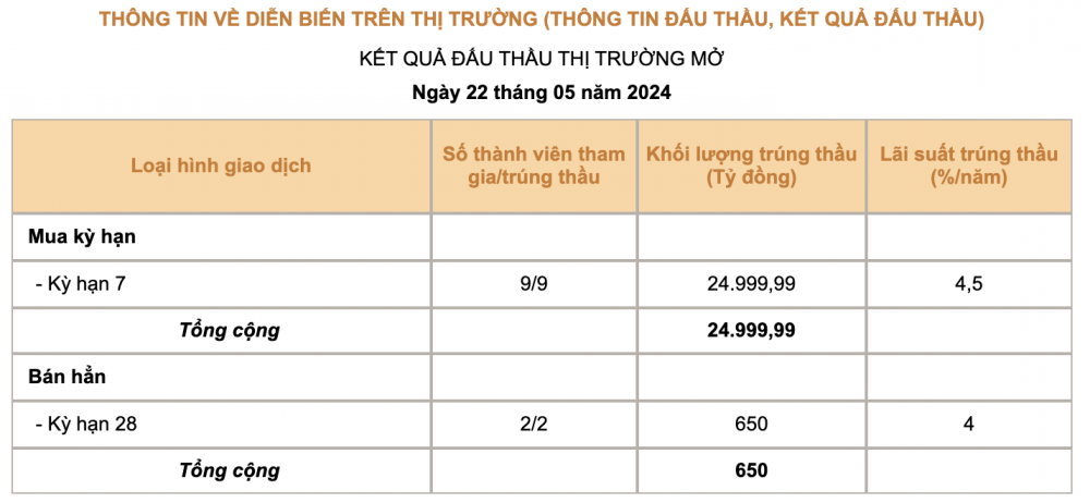 Đồng thời, trong ngày 22/5, Ngân hàng Nhà nước đã phát hành 650 tỷ đồng tín phiếu với kỳ hạn 28 ngày, với lãi suất trúng thầu đã tăng từ 3,9%/năm trong phiên trước đó lên 4%/năm.