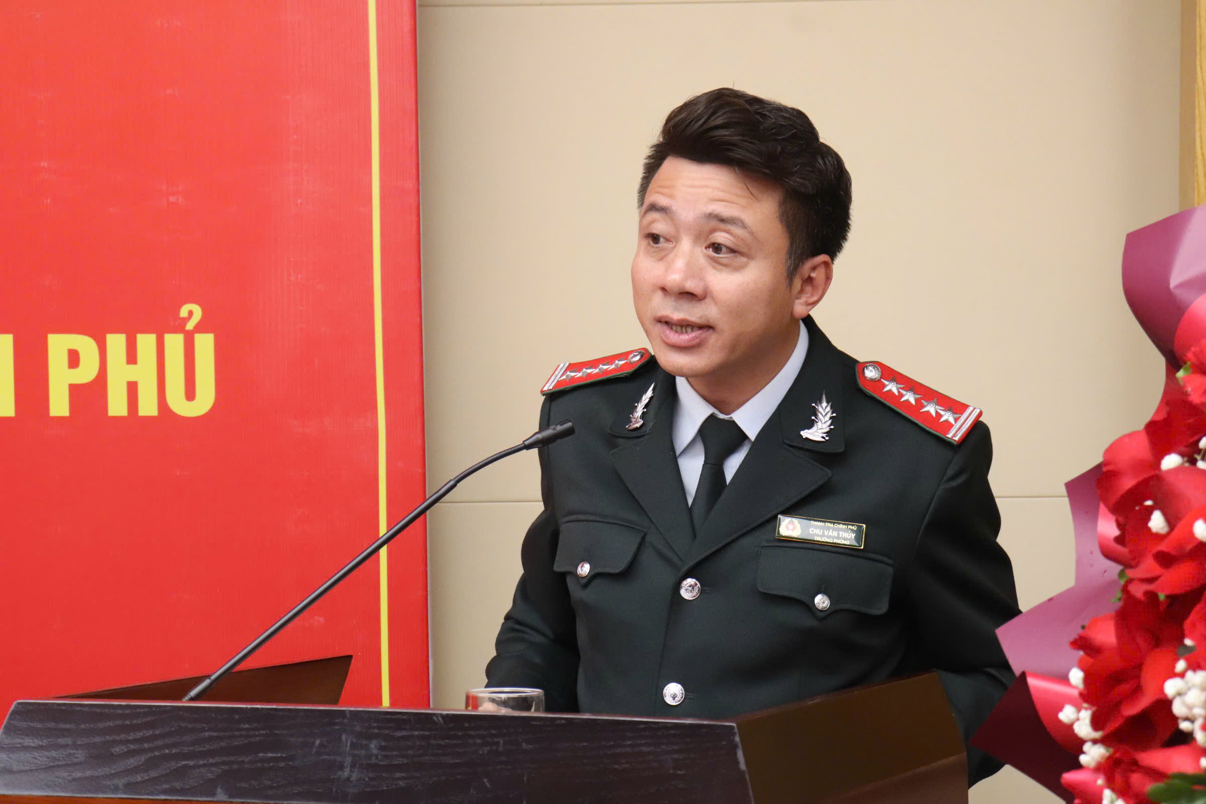 Phó Tổng Thanh tra Chính phủ Nguyễn Văn Cường trao quyết định, tặng hoa và phát biểu giao nhiệm vụ cho tân Phó Tổng Biên tập Báo Thanh tra Chu Văn Thủy.