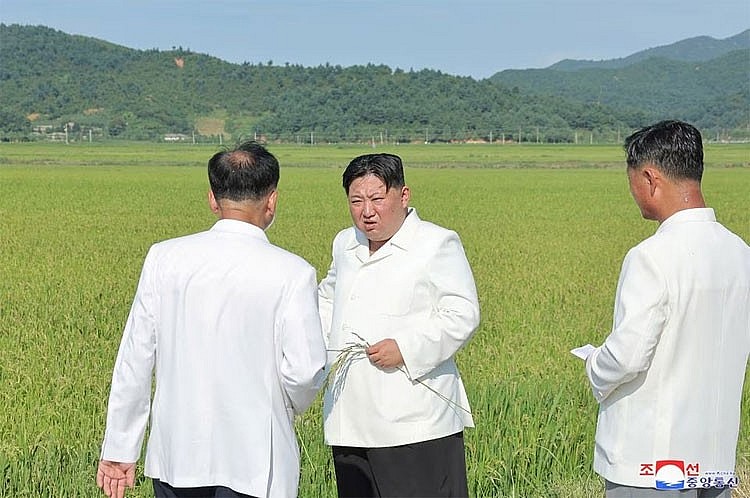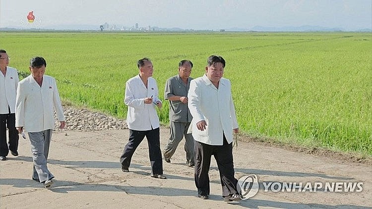 Chủ tịch Triều Tiên Kim Jong Un đã đến thăm những cánh đồng lúa ở huyện Anbyon, phía đông tỉnh Kangwon, nơi đất nông nghiệp bị ngập lụt do mưa lớn sau bão.