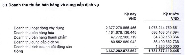 Trong đó, xét về cơ cấu doanh thu trong nửa đầu năm 2024, doanh thu hoạt động xây dựng tăng 121,5%, lên 2.377,3 tỷ đồng và chiếm 64,8% tổng doanh thu; doanh thu bán hàng hoá (kinh doanh vật tư) tăng 98,2%, lên 1.161,8 tỷ đồng và chiếm 31,7% tổng doanh thu; và các hoạt động khác biến động không đáng kể.