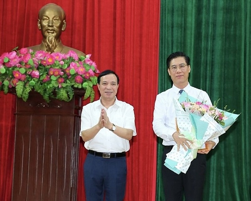 | Phó Bí thư Tỉnh uỷ Thanh Hoá Lại Thế Nguyên trao quyết định và chúc mừng ông Lữ Minh Thư. |