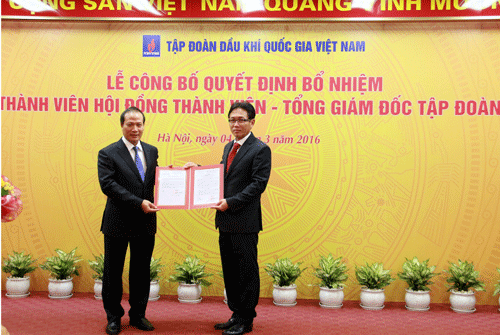 Chủ tịch Hội đồng thành viên Tập đoàn Dầu khí Việt Nam - Nguyễn Quốc Khánh trao Quyết định bổ nhiệm Tổng Giám đốc Tập đoàn cho ông Nguyễn Vũ Trường Sơn |