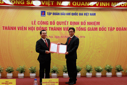 | Thứ trưởng Bộ Công Thương Cao Quốc Hưng (bên trái) trao Quyết định bổ nhiệm Thành viên Hội đồng Thành viên Tập đoàn Dầu khí Việt Nam cho ông Nguyễn Vũ Trường Sơn |