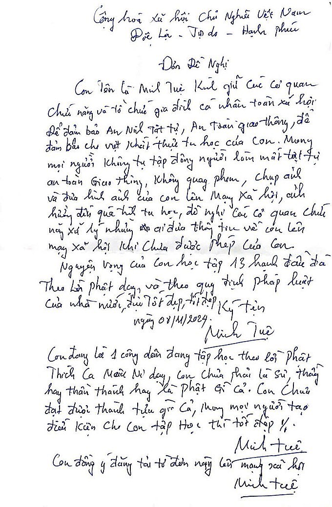 Trong đơn, ông Thích Minh Tuệ xưng "con" và gửi các cơ quan chức năng và tổ chức, cá nhân toàn xã hội.