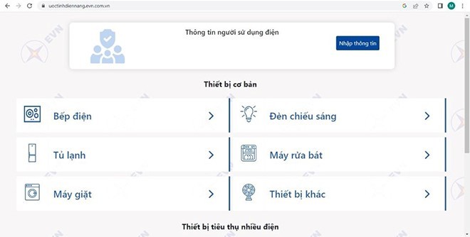 Công cụ ước tính sản lượng điện tiêu thụ với số lượng, chủng loại thiết bị điện, công cụ sẽ ước tính sản lượng điện tiêu thụ của mỗi thiết bị theo từng tháng. Đồng thời, công cụ cũng chỉ ra thiết bị tốn điện nhất trong tháng, giúp khách hàng điều chỉnh thói quen sử dụng điện hiệu quả tiết kiệm (https://uoctinhdiennang.evn.com.vn) cụ thể là: