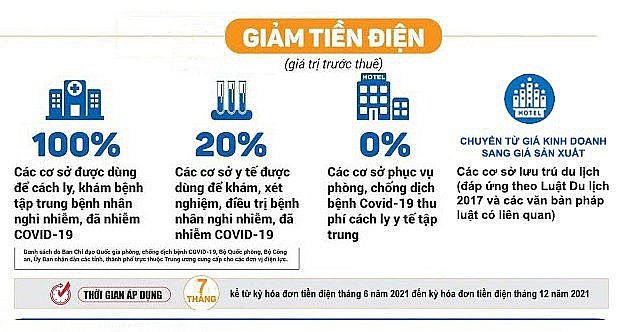 Thời gian áp dụng hỗ trợ giảm giá điện, giảm tiền điện cho khách hàng kéo dài trong 7 tháng, kể từ kỳ hóa đơn tiền điện tháng 6/2021 đến kỳ hóa đơn tiền điện tháng 12/2021. Cụ thể, sẽ có 303 khách hàng sử dụng điện là cơ sở lưu trú du lịch theo quy định tại Luật Du lịch 2017 và các văn bản pháp luật có liên quan, được giảm giá bán điện từ mức giá bán lẻ điện áp dụng cho kinh doanh bằng mức giá bán lẻ điện áp dụng cho các ngành sản xuất theo quy định tại Quyết định số 648/QĐ-BCT ngày 20/3/2019 của Bộ trưởng Bộ Công Thương.