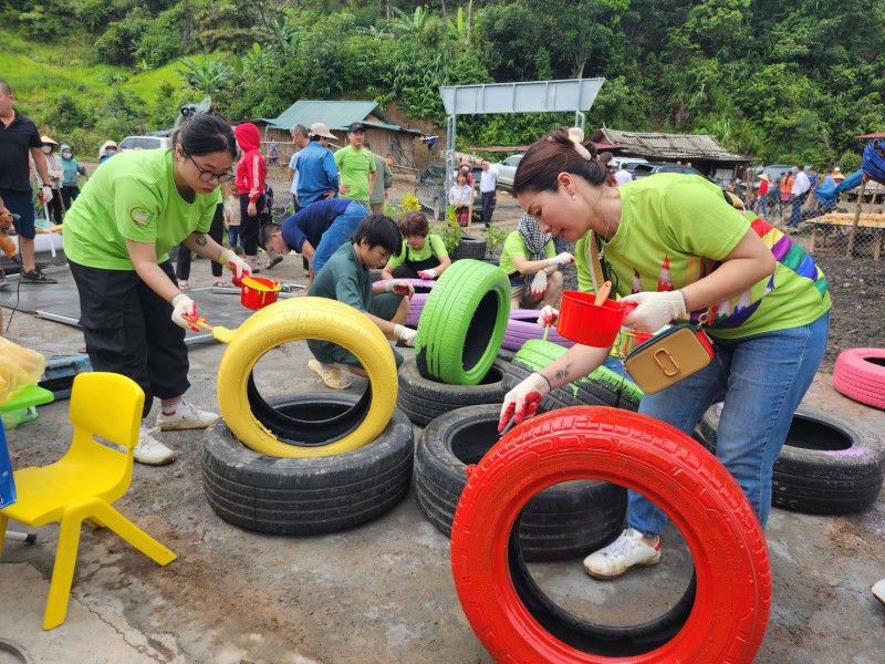 | Các nhà tài trợ tham gia trang trí sân chơi cho học sinh tại các điểm trường |