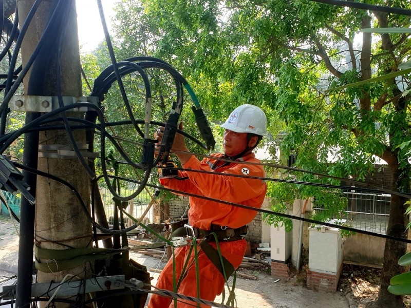 | Công nhân Điện lực thành phố Thanh Hóa (PC Thanh Hóa) thực hiện thay dây dẫn đảm bảo mang tải góp phần nâng cao tính ổn định trong cấp điện cho khách hàng mùa nắng nóng 2023 |