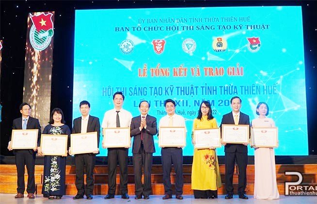 | Đại diện nhóm tác giả PC Thừa Thiên Huế (thứ tư từ phải sang) nhận bằng khen tại Lễ tổng kết và trao giải Hội thi sáng tạo Kỹ thuật tỉnh Thừa Thiên Huế lần thứ XII năm 2022 |