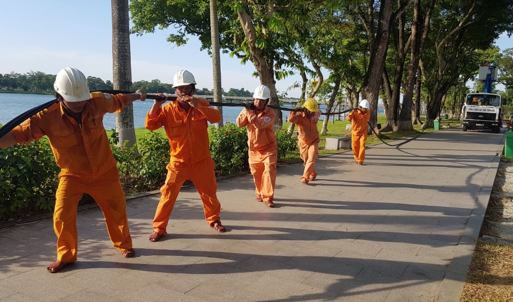 | Công nhân PC Thừa Thiên Huế kéo dây bổ sung nguồn điện cho các lễ hội ven sông Hương |