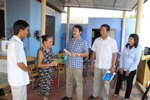 | Chủ tịch kiêm Giám đốc Petrolimex Quảng Bình Lê Anh Hùng (đứng giữa) thăm hỏi các đơn vị và tặng quà các gia đình CBCNV bị thiệt hại nặng do lũ lụt |