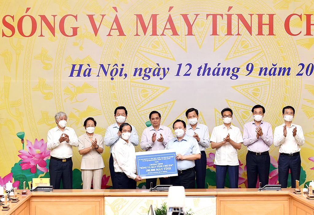 | Thủ tướng Phạm Minh Chính và các đại biểu chứng kiến Chủ tịch Ủy ban Quản lý vốn tại doanh nghiệp Nguyễn Hoàng Anh đại diện các tập đoàn, tổng công ty trao máy tính tặng Chương trình ”Sóng và máy tính cho em" |