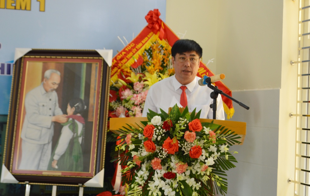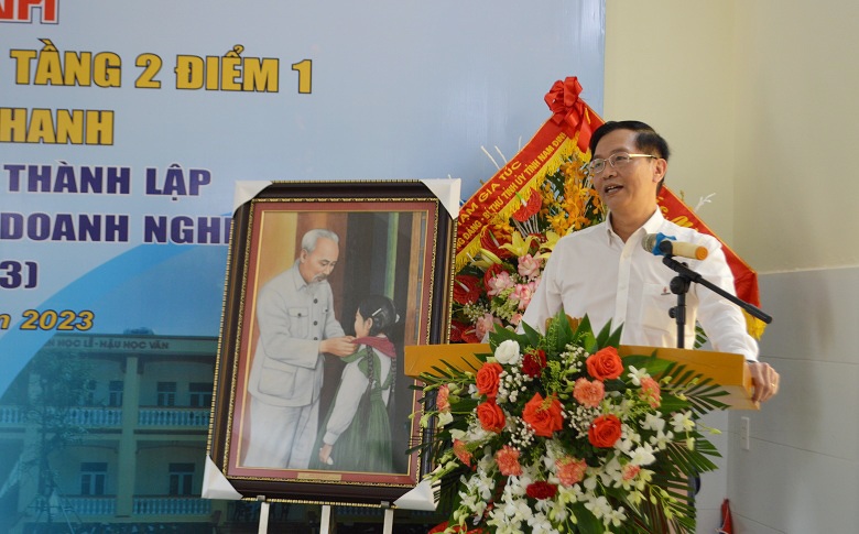 | Đồng chí Trần Quang Dũng phát biểu tại lễ khánh thành nhà ăn bán trú và 3 phòng học tầng 2 trường Tiểu học Nam Thanh |