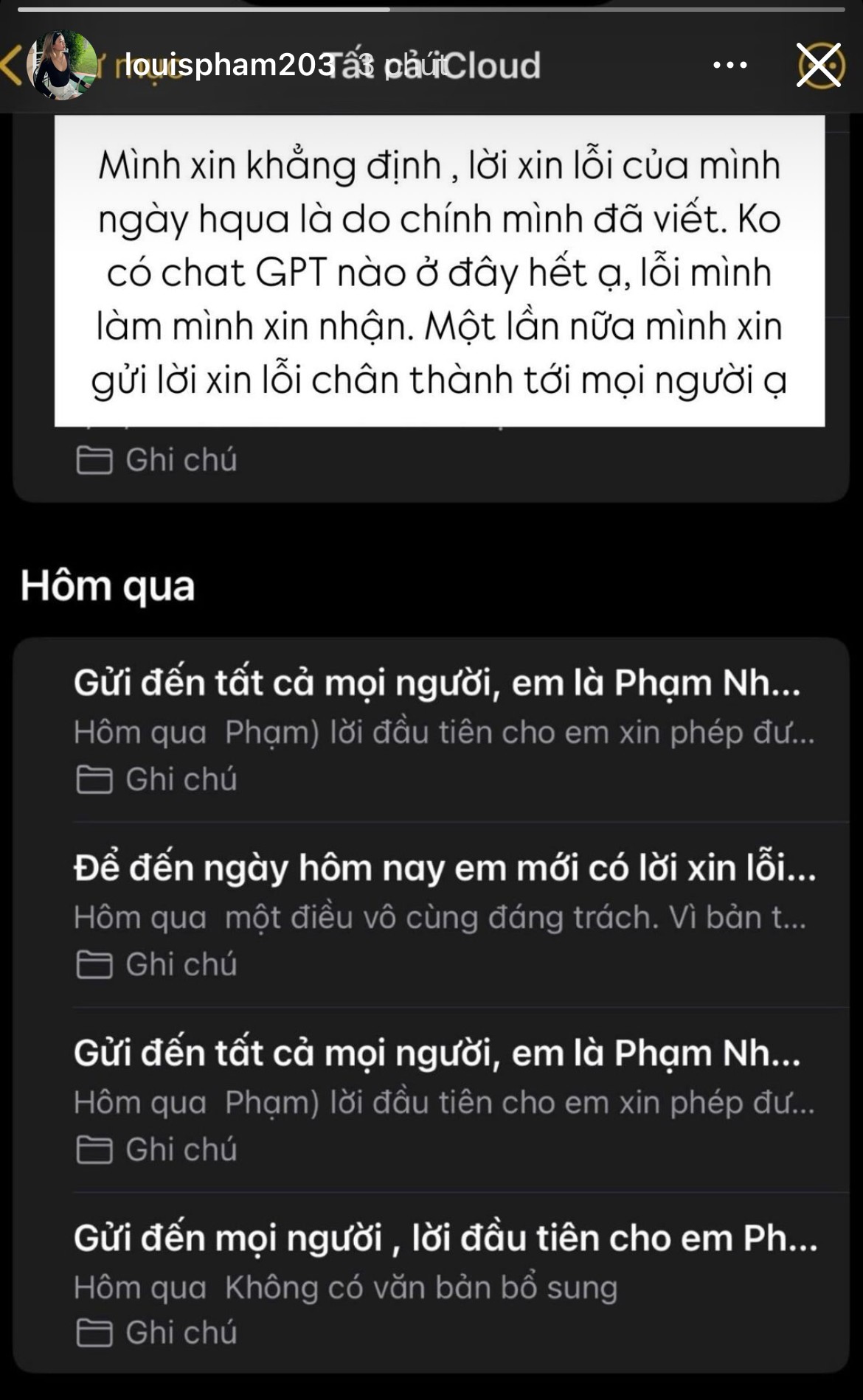 Đến trưa 22/9, trên tài khoản Instagram cá nhân của mình, Phạm Như Phương khẳng định đây là lời xin lỗi của chính mình tự viết, không sử dụng Chat GPT như nhiều người nói. Để chứng minh điều này, cô chụp ảnh các bản nháp lời xin lỗi được cô viết trong ghi chú cá nhân từ trước đó.