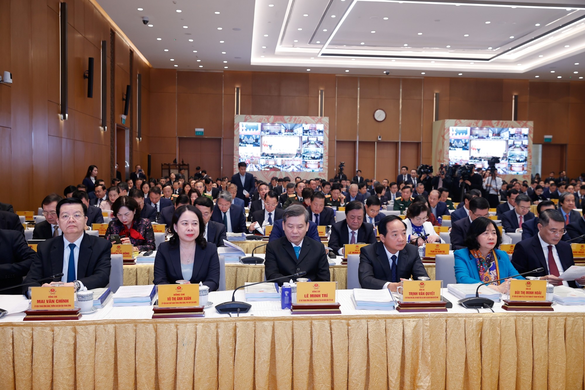 | Tổng Bí thư Tô Lâm; Chủ tịch nước Lương Cường; Thủ tướng Phạm Minh Chính; Chủ tịch Quốc hội Trần Thanh Mẫn dự và chủ trì hội nghị. Ảnh: VGP/Nhật Bắc |
