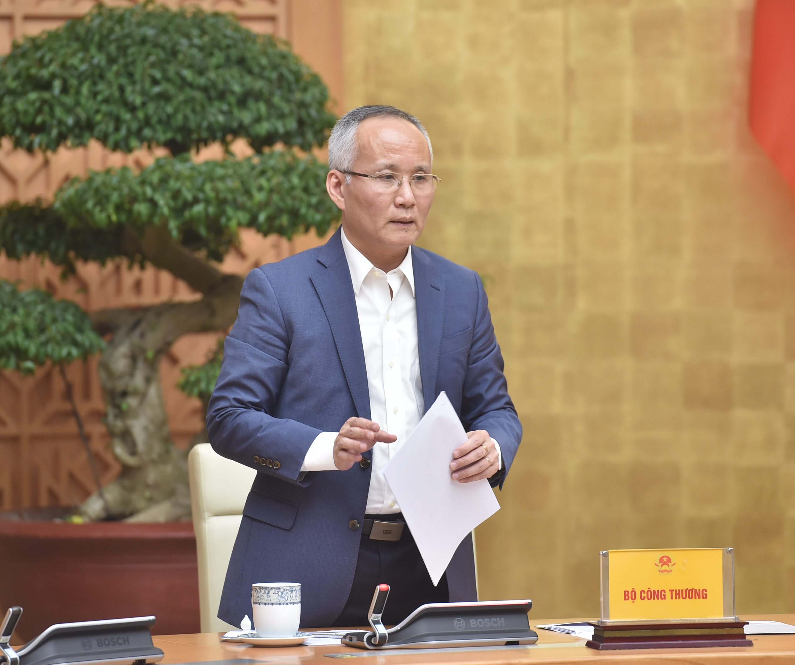 | Thứ trưởng Bộ Công Thương Trần Quốc Khánh báo cáo tình hình tại cuộc họp |