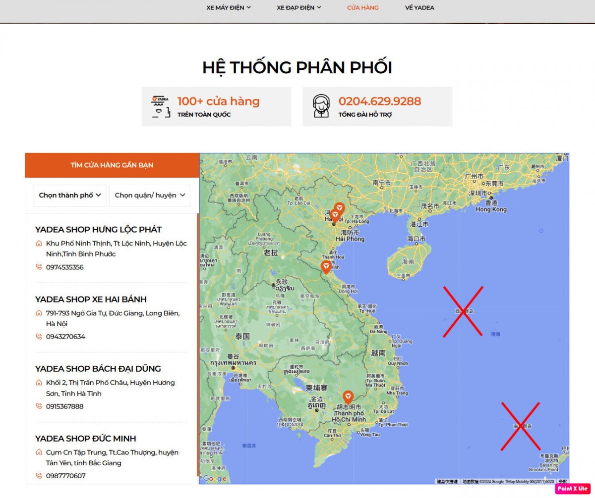 Cụ thể, vào tháng 5, nhiều khách hàng đã phản ánh việc không thể tìm kiếm địa chỉ các cửa hàng chính hãng của Yadea Việt Nam tại trang chủ doanh nghiệp. Tuy nhiên, sau khi tìm hiểu sâu hơn, người dùng ở nước ngoài vẫn có thể xem được bản đồ hiển thị vị trí các cửa hàng tại trang web của Yadea Việt Nam. Đặc biệt, hai quần đảo thuộc chủ quyền Việt Nam là Hoàng Sa và Trường Sa được hiển thị bằng tiếng Trung Quốc với phiên âm Tây Sa và Nam Sa. Đây là hai tên gọi mà người Trung Quốc sử dụng cho hai quần đảo Hoàng Sa và Trường Sa, thuộc chủ quyền của Việt Nam.