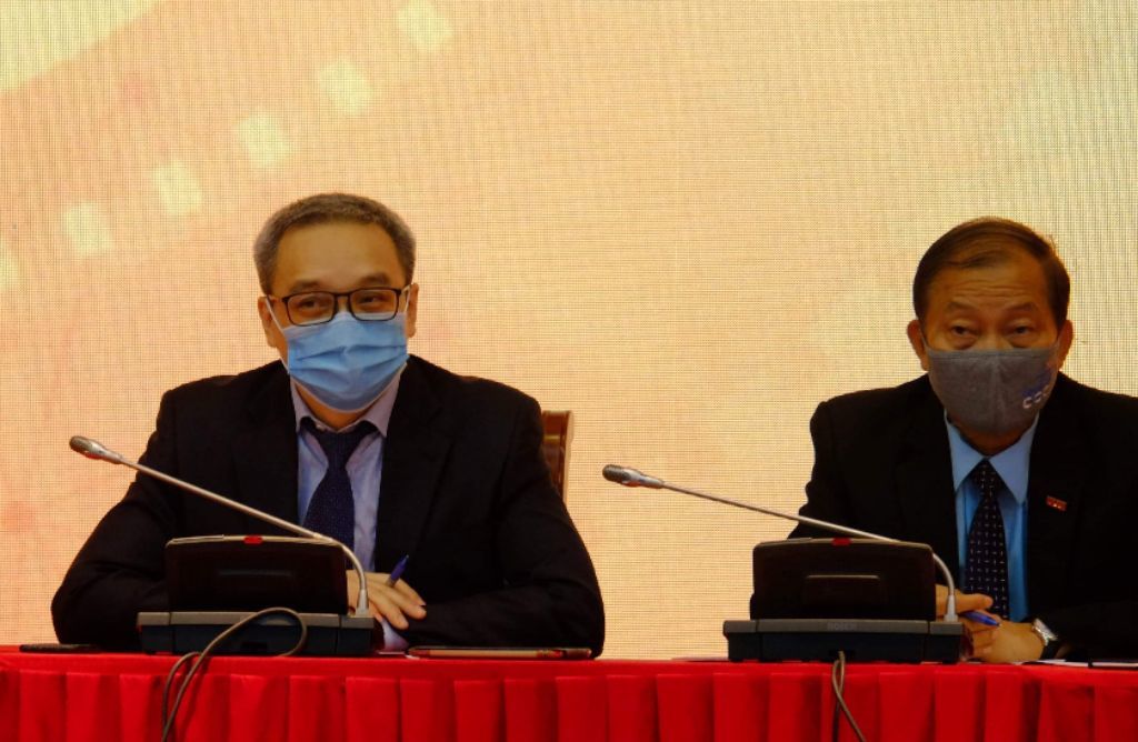 | Thứ trưởng Bộ TT&TT Phan Tâm (bên trái) và ông Hoàng Quang Phòng - Phó Chủ tịch VCCI - trả lời các câu hỏi tại buổi họp báo |