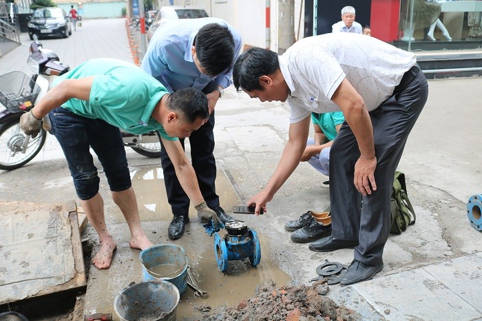 Kiểm định đồng hồ đo nước tại Chung cư 143 Trần Phú, Hà Đông, Hà Nội. Ảnh: Phong Lâm