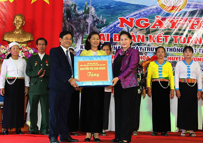 Chủ tịch Quốc hội Nguyễn Thị Kim Ngân tặng quà cho khu dân cư, các gia đình, cá nhân tiêu biểu và hộ nghèo trong thôn Bùi Trám