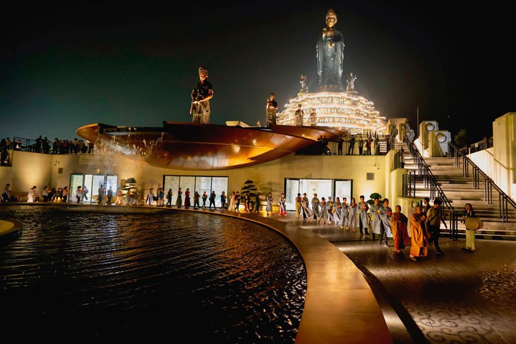 | Giữa không gian hùng vĩ của ngọn núi thiêng Bà Đen tiệp với mây trời, các Chư tôn Đại đức và Tăng ni Phật tử long trọng thể hiện lòng tôn kính của Phật tử hướng về Đức Quán Thế Âm trong ngày đản sinh. (Ảnh: Ngô Trần Hải An) |