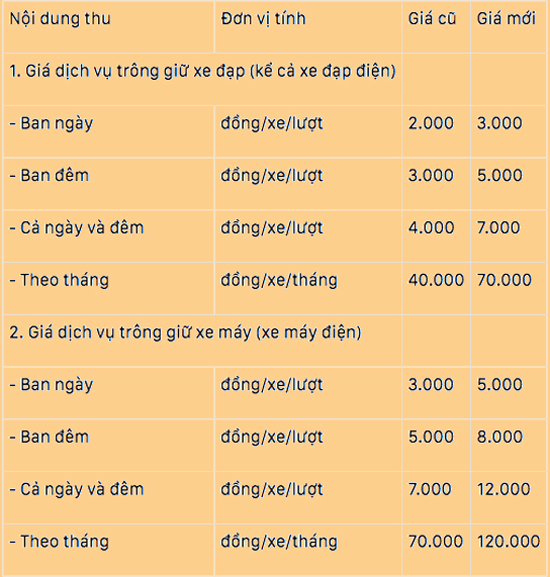 Bảng giá trông giữ xe đạp, xe máy từ ngày 1/1/2018