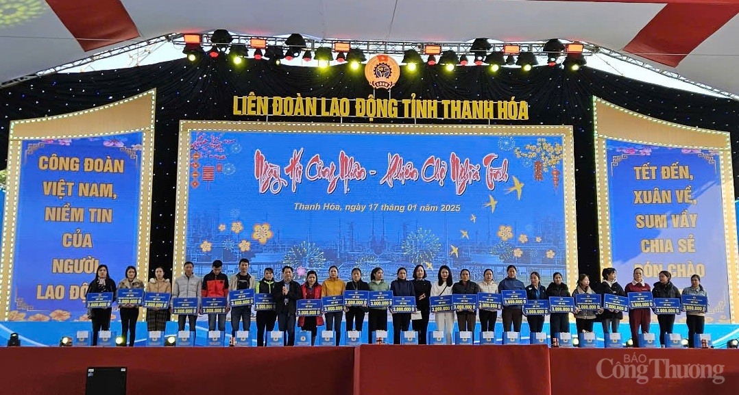 Chương trình “Tết sum vầy - Xuân ơn Đảng” và “Ngày hội công nhân - Phiên chợ nghĩa tình” năm 2025, gồm chuỗi hoạt động liên tục của các cấp công đoàn trong tháng áp Tết Nguyên đán, với nhiều hoạt động thiết thực, ý nghĩa như: Liên đoàn Lao động tỉnh Thanh Hóa thăm hỏi, trao hơn 18.500 suất quà cho đoàn viên, người lao động có hoàn cảnh khó khăn, bị bệnh hiểm nghèo, tai nạn lao động… với tổng trị giá là 12,8 tỉ đồng. Hỗ trợ 62 nhà “Mái ấm Công đoàn”, với tổng trị giá hơn 2,4 tỉ đồng. Các cấp công đoàn trong tỉnh trích từ kinh phí thường xuyên và vận động các cơ quan, đơn vị, doanh nghiệp thăm hỏi, tặng quà cho trên 350.000 lượt đoàn viên, người lao động, với tổng giá trị khoảng 190 tỉ đồng. |