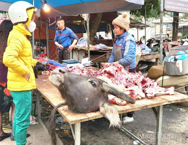 Đặc biệt, chợ Tết thường có thêm quầy thịt trâu, để người mua yên tâm không lo “trộn thịt bò”, những người bán hàng đã bày cả “đầu trâu” lên để chứng minh với người mua đây là thịt “trâu xịn”.