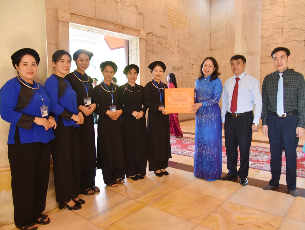 | Phó Chủ tịch nước Võ Thị Ánh Xuân tặng quà Ban Quản lý các di tích Quốc gia đặc biệt tỉnh. Ảnh: Báo Cao Bằng |