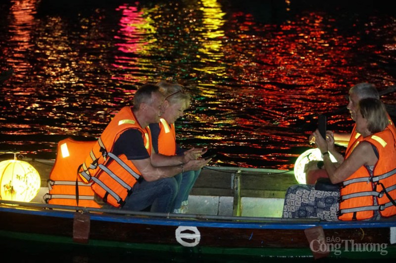 | Nhiều du khách có những khoảnh khắc vui vẻ khi trải nghiệm đi thuyền trên sông Hoài dọc theo phố cổ trong thời điểm tắt điện. |