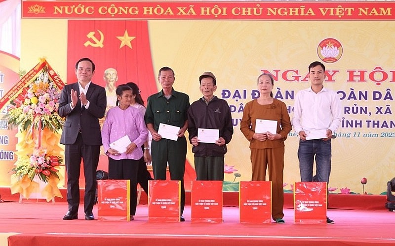 | Phó Thủ tướng Chính phủ Trần Lưu Quang cùng lãnh đạo Tỉnh ủy, UBND, Mặt trận Tổ quốc tỉnh Thanh Hóa dự, chung vui Ngày hội Đại đoàn kết toàn dân tộc với Nhân dân và cán bộ khu dân cư thôn Chợ Rủn, xã Đông Khê, huyện Đông Sơn. |