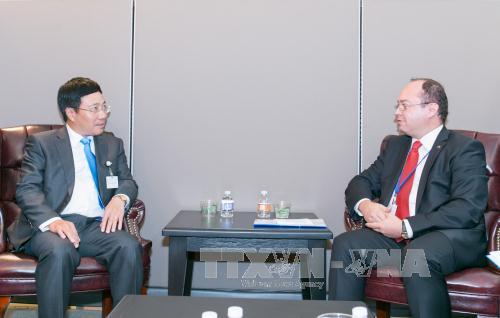 | Phó Thủ tướng Phạm Bình Minh tiếp xúc song phương với Bộ trưởng Ngoại giao Romania, ông Bogdan Lucian Aurescu. |